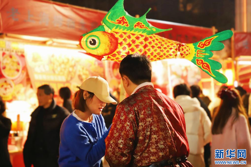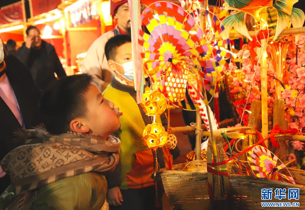 城市广场上,一身传统装扮的“卖货郎”推着挂满鱼灯、风车的小推车在人群中穿梭,吸引孩子们驻足观看。新华网发 郭妍廷 摄