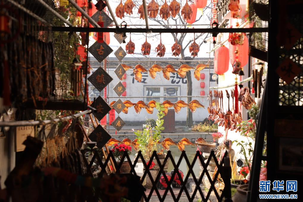 安昌古镇里的房檐下悬挂着酱鸭、鱼干、腊肠,琳琅满目,酱香四溢。新华网 宋越 摄