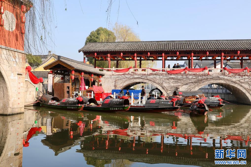 绍兴市柯桥区安昌古镇处处装点上“中国红”,烘托出浓浓的节日氛围。新华网 宋越 摄