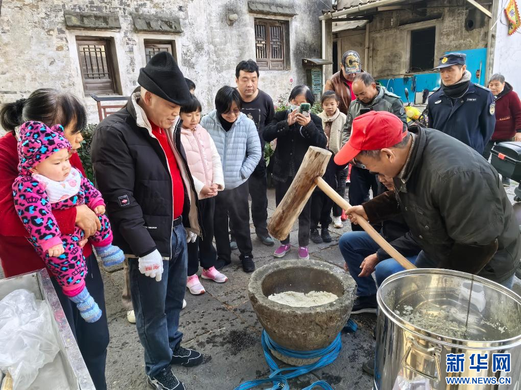 在绍兴市越城区府山街道,市民游客体验打年糕等传统年俗活动。新华网发 绍兴市委宣传部供图