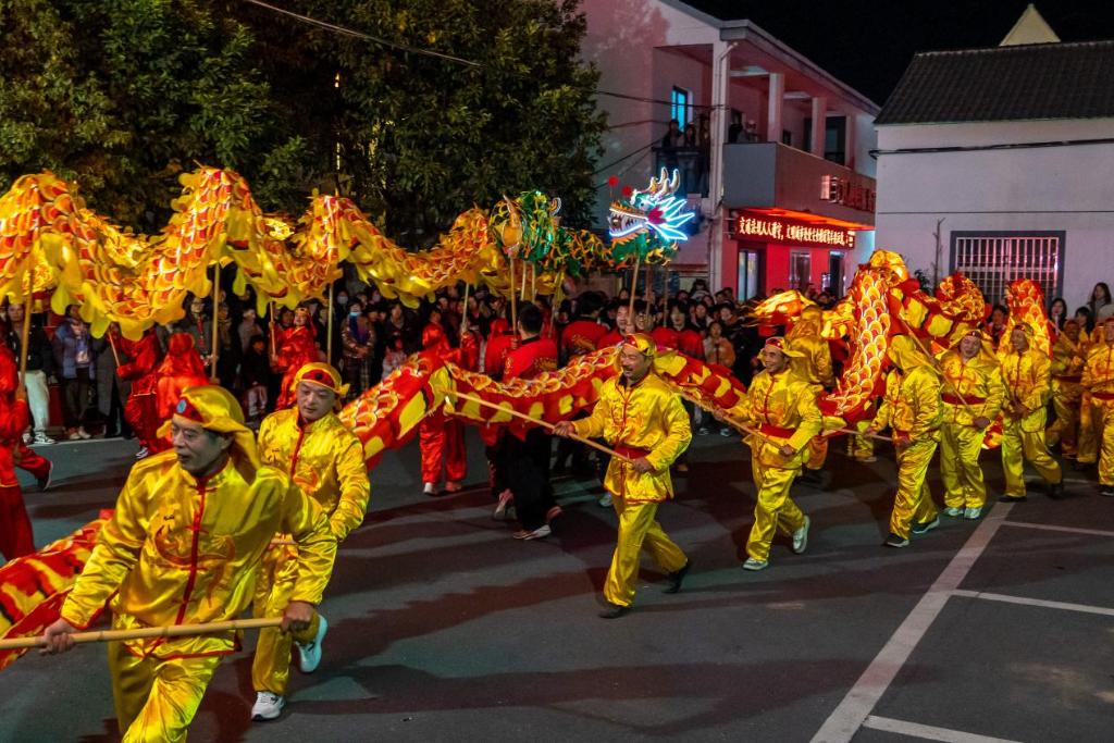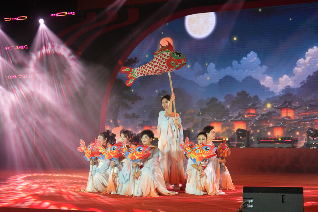 在湖州市南浔区和孚镇新荻村“我们的村晚”上,非遗舞蹈《吕山鱼灯》与《白水村鱼灯》以其精湛的表演,拉近了台上台下、城乡之间的情感距离。新华网发 湖州市委宣传部供图