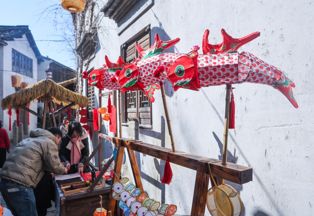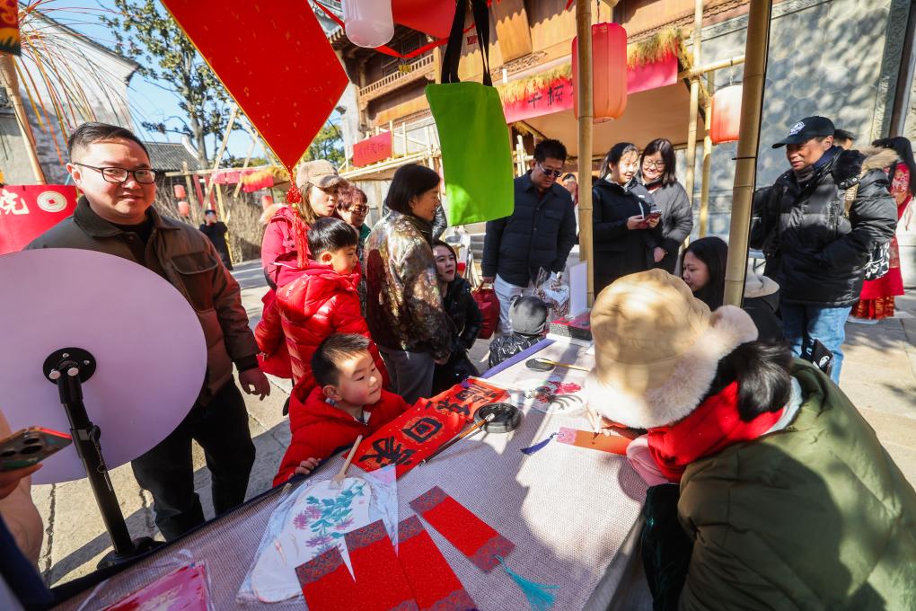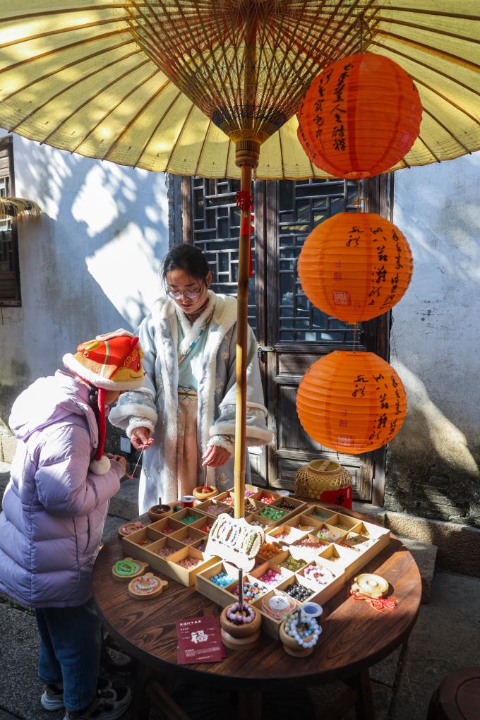 1月29日,游客在濮院时尚古镇的非遗市集上体验特色文化。