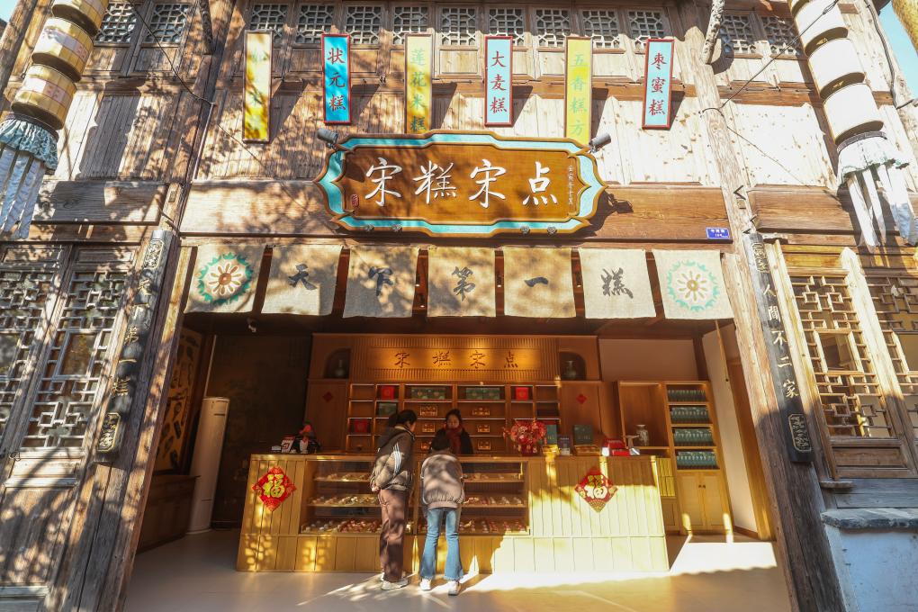 1月29日,游客在濮院时尚古镇内选购传统糕点。
