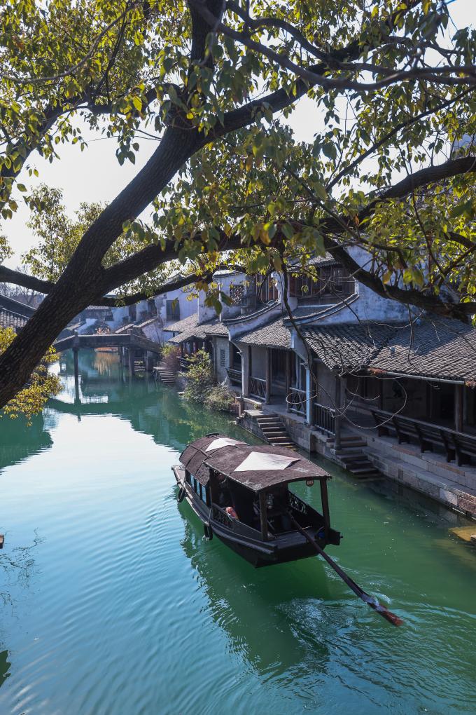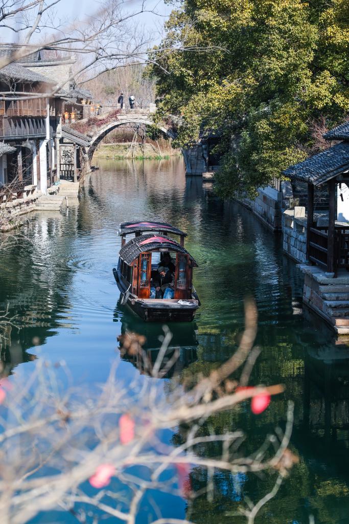 1月29日,手划船载着游客行驶在濮院时尚古镇的河道中。