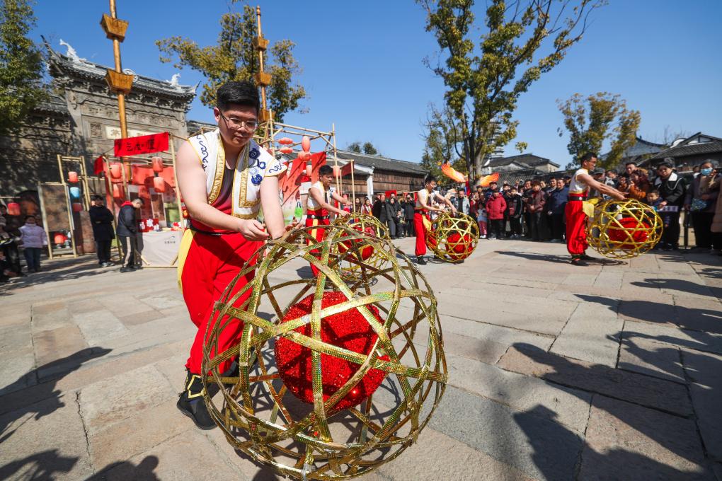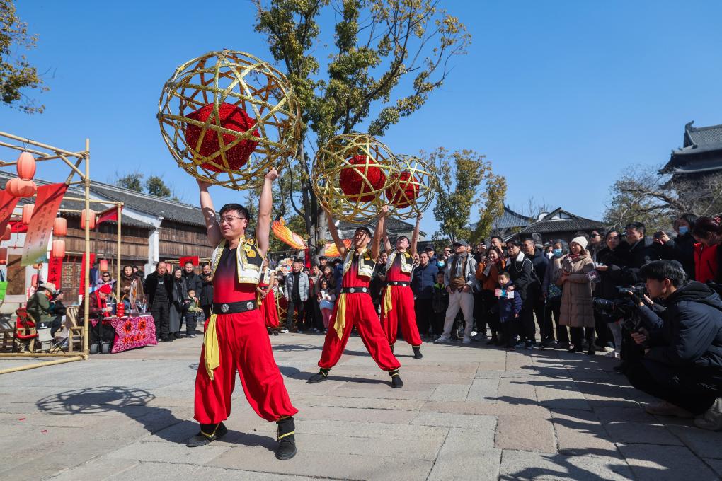 1月29日,游客在濮院时尚古镇内观看非遗滚灯表演。