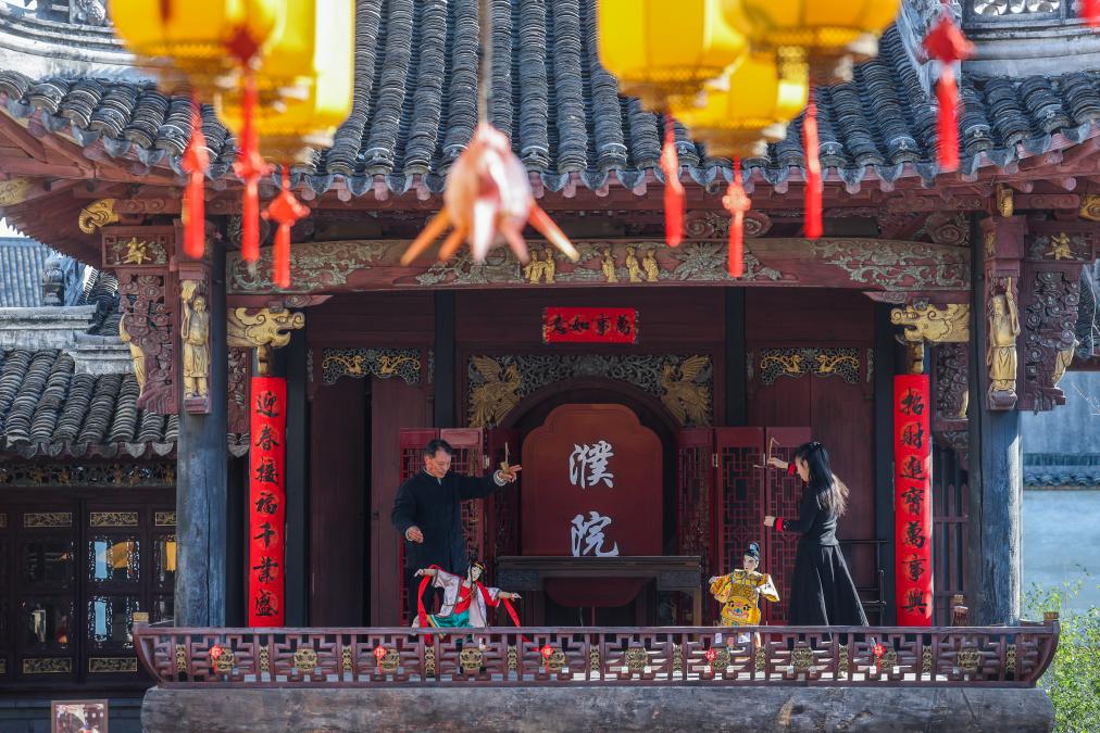 1月29日,演员在濮院时尚古镇的古戏台上表演提线木偶。