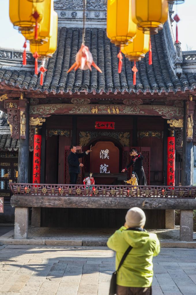 1月29日,游客在濮院时尚古镇观看提线木偶演出。
