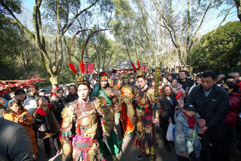 除了沉浸式灯光秀,还有一系列演出。调腔、舞乐蛇韵、叠罗汉……一场场非遗表演在大佛寺景区持续上演。在沉浸式的NPC互动环节,景区结合热门的“悟空”主题,配合木化石林主题光影,真人演绎机甲悟空秀,还有充满科技感的古风IP形象,充分阐释“国潮中国年”。更有击鼓纳福、投财纳福、福运娃娃机、圈住财福……各种充满国风韵味的游戏在景区汇聚。今年大佛寺的六大年味市集点位,有80+市集摊位,文创、美食、潮牌……一站式满足游客的新春购物需求。