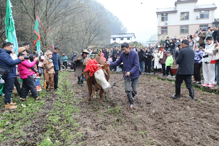 “一鞭春牛,春回大地!二鞭春牛,风调雨顺!三鞭春牛……”随着少年清朗的声音响起,祭春仪式在梧桐祖殿前的田野中迎来了活动高潮——鞭春牛。由老农牵出角挂红花、身披红布的耕牛,扮演春神句芒的村中少年手持柳鞭,鞭打春牛,正式开启新春“第一耕”。