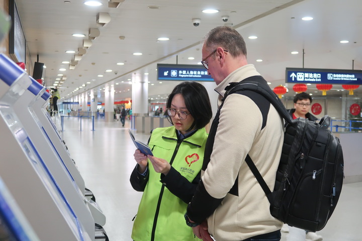 上海机场边检“百人外语志愿服务队”民警正在协助外国旅客办理入境手续。新华社记者唐斯琦 摄