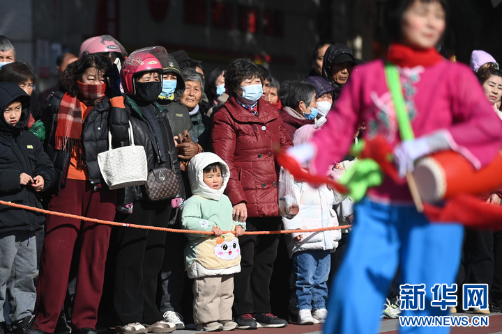 2月8日,观众在南浔区和孚镇街区观看腰鼓队表演。
