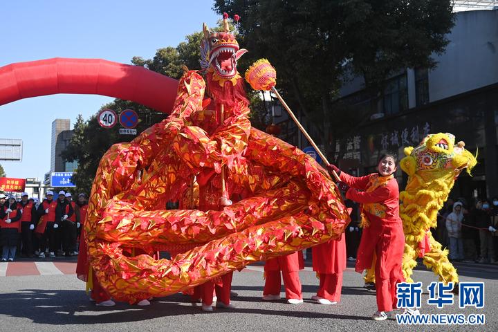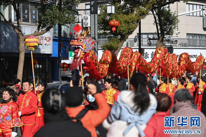 2月8日,舞龙队在南浔区和孚镇街区巡游。