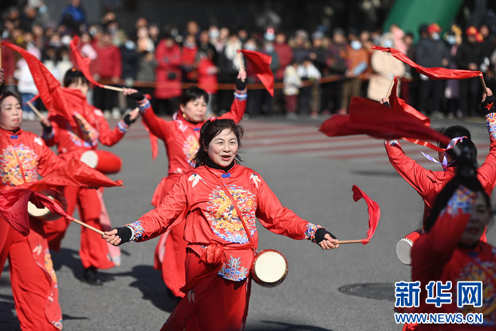 2月8日,乡村女子腰鼓队在南浔区和孚镇街区巡游表演。