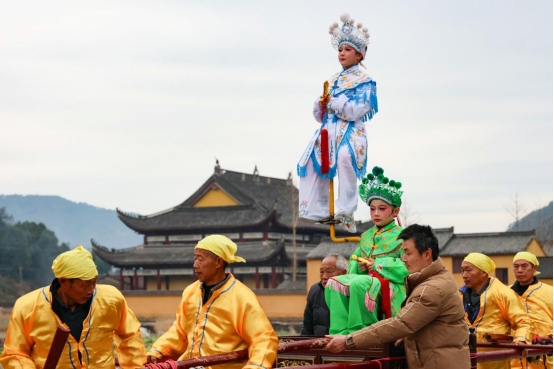 在临海汇溪,元宵节的重头戏莫过于抬阁表演。抬阁,又称“抬角”“高抬”,是一种源自中原地区的传统民俗巡游艺术,历经千年流传至东南沿海,与当地文化交融,形成了独具特色的风格。白天的抬阁活动中,数名孩童身着华服,扮作古装戏曲人物,立于高台之上,宛若仙童临凡。他们以钱王像为排首,以《穆桂英挂帅》《八仙过海》《白蛇传》《济公活佛》等经典剧目为蓝本,组成精巧的造型,固定在四方形阁子的铁柱与支架上,由人抬着缓缓前行。阁子高约3米,分2至3层,每层1人,底部由5至6人抬轿,造型栩栩如生,仿佛将戏曲故事搬到了现实。巡游时,4架阁子齐出,场面恢宏,气势磅礴,令人叹为观止,为元宵佳节增添了浓厚的文化韵味与喜庆氛围。