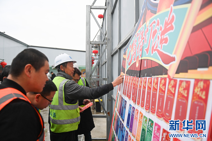 2月12日,中建三局的建设者在浙江杭州余杭国际体育中心项目部猜灯谜。 新华社记者 黄宗治 摄