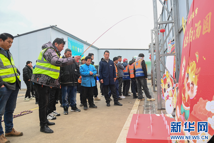 2月12日,中建三局的建设者在浙江杭州余杭国际体育中心项目部参加“欢乐钓汤圆”游戏。 新华社记者 黄宗治 摄