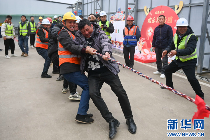 2月12日,中建三局的建设者在浙江杭州余杭国际体育中心项目部参加拔河比赛。 新华社记者 黄宗治 摄