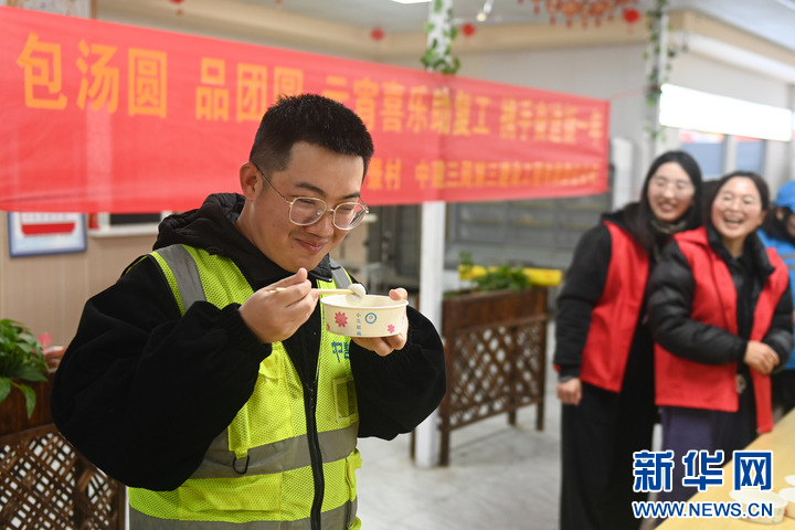 2月12日,中建三局的建设者在浙江杭州余杭国际体育中心项目部品尝汤圆。 新华社记者 黄宗治 摄