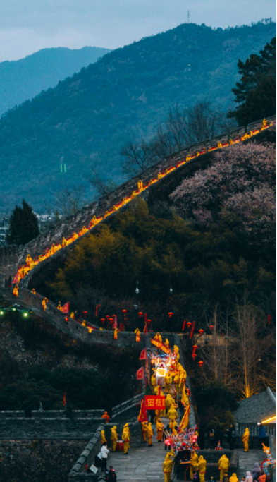夜幕降临,巍峨的江南八达岭上,一黑(新龙)一白(老龙)两条百米大田板龙缓缓而下,开始巡城。两条龙时而凌空腾跃,时而左右摇摆,速度忽快忽慢,在激昂的鼓声中,板龙从兴善门下城门,在城外游走翻转,吸引了观众驻足观看。