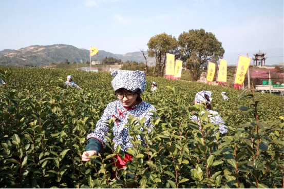 当天,浙江绿茶·温州早茶开采仪式同步举行。与会人员走进苍南县桥墩镇五凤茶博览园观摩,采茶工人正在茶园里忙碌着,并进行了茶艺展示。仪式上,浙江绿茶开采时间、浙江省十大茶旅线路以及温州早茶品牌IP形象发布,拉开了浙江早春茶季的序幕。