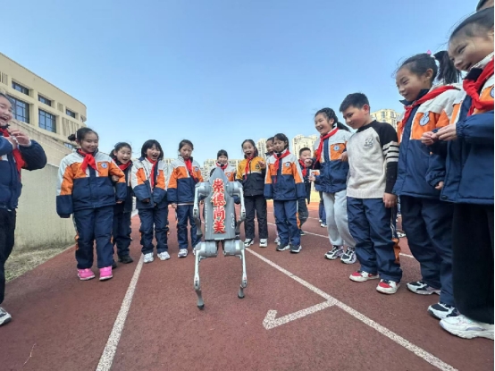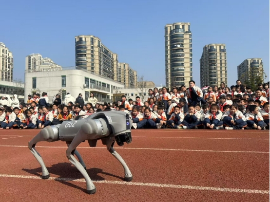 “太神奇了!真让人大开眼界!”“原来高科技就在我们身边啊!”当杭州宇树科技有限公司研发的四足机器狗Go2来到同学们身边时,校园里一片欢腾。闪亮登场的Go2身披姚小校训“崇德尚美 知行合一”,它们在操场跑道上一一站定,随后亮出一个个“绝活”——蹲下、起立、空翻、握手,酷炫的造型、灵活的动作尽显科技范儿,为开学典礼增添了满满新意,也激发了学生学科学、爱科学、用科学的热情。