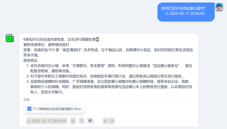 据悉,“智能体”是基于内部规则,根据环境信息主动采取行动以实现特定目标的实体,具备学习能力与适应能力。以结合鹿城区社工部具体业务开发的“社区成功案例问答”模块为例,用户在该模块不仅可以了解本地社区的成功案例,还能深入探索具体案例的“成功秘诀”,并结合自身工作的特点向其发问,得到详尽回答。