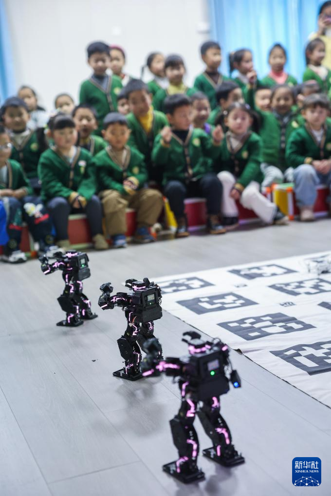 2月19日,诸暨市暨南街道南悦幼儿园的孩子们在拓展课程上观看机器人舞蹈。
