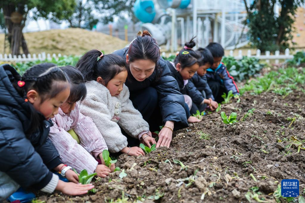 2月19日,诸暨市暨南街道街亭幼儿园的老师在农耕课上指导孩子们种植蔬菜苗。