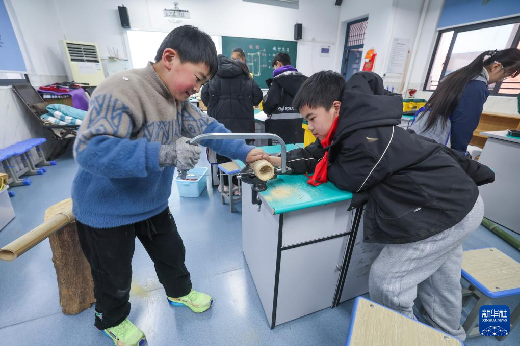 2月19日,诸暨市暨南街道暨南小学的学生们在拓展性课程木工课上学习木工技能。