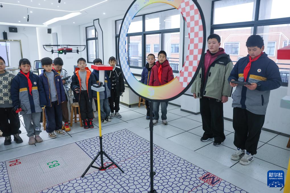 2月19日,诸暨市暨南街道暨南小学的学生们在拓展性课程上学习无人机操作技术。