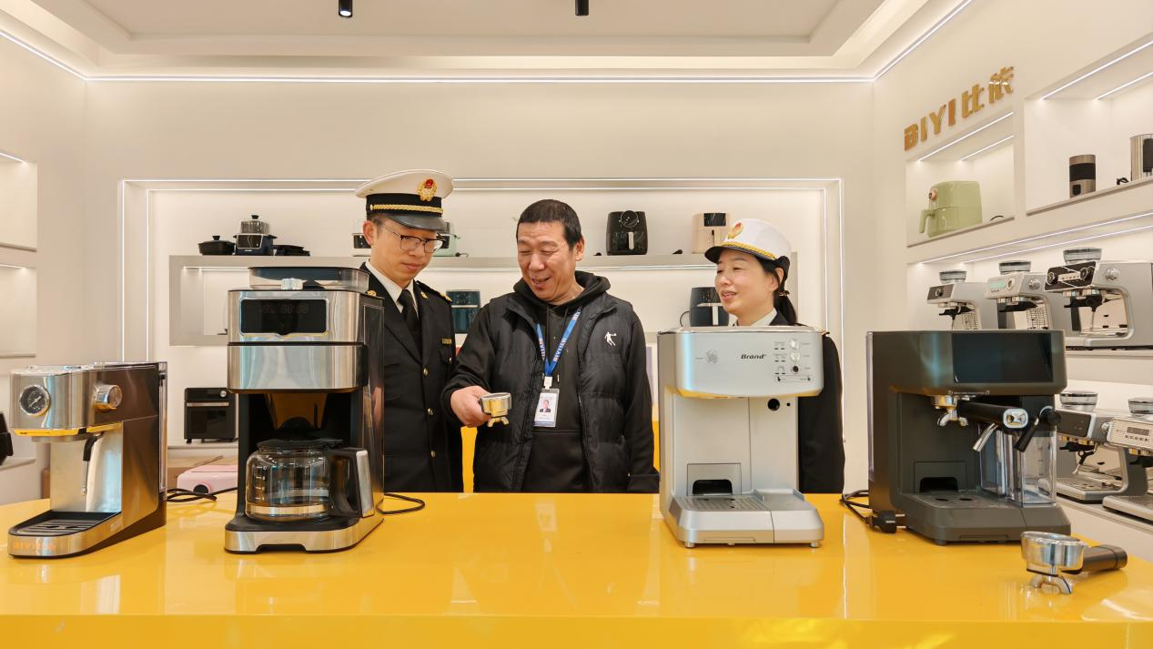 在“比依电器”的展厅里,各式各样的小家电产品琳琅满目,其中包括新研发的10多款咖啡机,有自动、半自动和美式、意式等不同类型,市场售价预估在几千元到几万元不等。自2024年6月交付出口订单以来,公司出口到美国、加拿大、德国等多个国家和地区的咖啡机已超两万台。