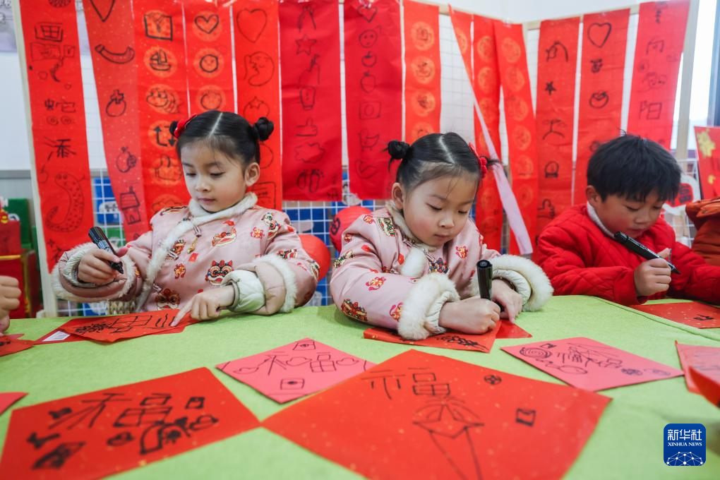 2月20日,孩子们在写新春福字和心愿。