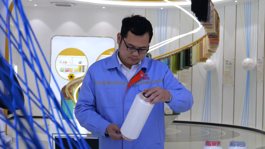 福建永荣锦江自主创新的环保再生绿色产品“爱赛纶”。新华社记者 宓盈婷、林凯 摄