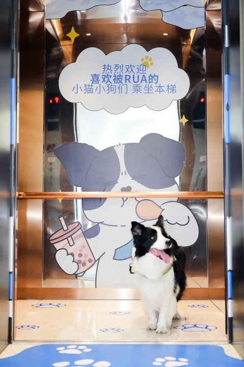 胖牧波波在杭州龙湖西溪天街,坐上了宠物专用电梯。
