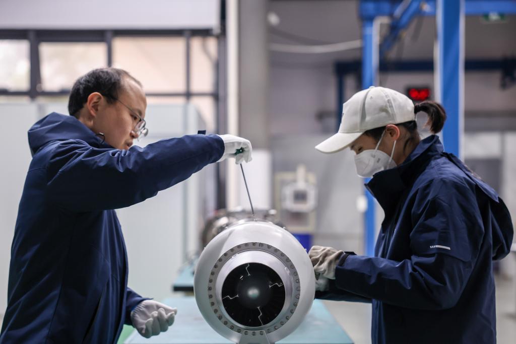 2月28日,浙江华擎航空发动机科技有限公司的工作人员在宁波市江北区的车间内装配无人机航空发动机产品。新华社记者 江汉 摄