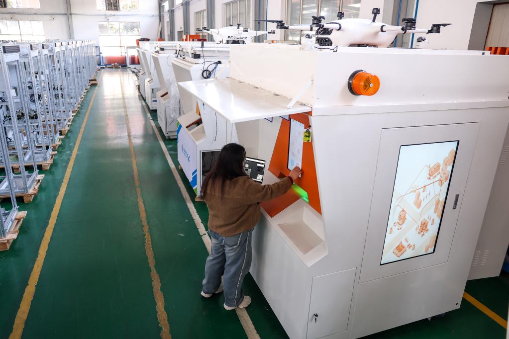 2月28日,工作人员在宁波市江北区宁波翼新智能科技有限公司的无人机配送智能站生产线上调试产品。新华社记者 江汉 摄