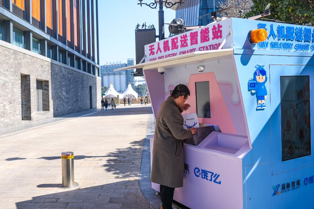 2月28日,市民在位于宁波市江北区老外滩的一处无人机配送智能站接收由无人机配送的外卖。新华社记者 江汉 摄