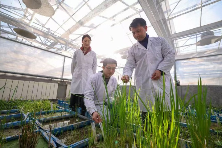 1月15日,中国水稻研究所研究员张健(右一)在研究所温室大棚内查看水稻样株的生长情况。新华社记者江汉 摄