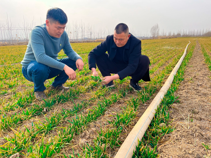 山东省嘉祥县金屯镇贺李胡村种粮大户张春杰(左一)正在和村干部一同查看麦苗长势。(受访对象供图)
