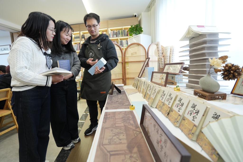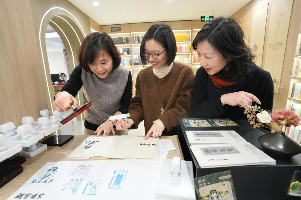 3月5日,在位于吴兴区爱山街道的湖州三联书店,市民在体验湖学系列文创产品。