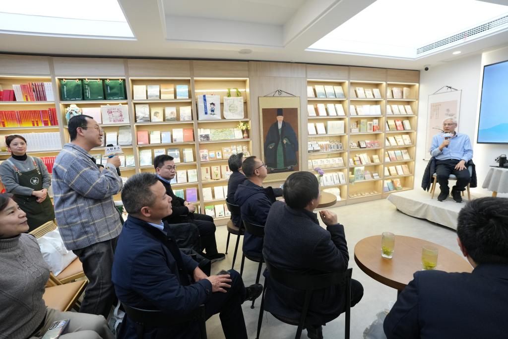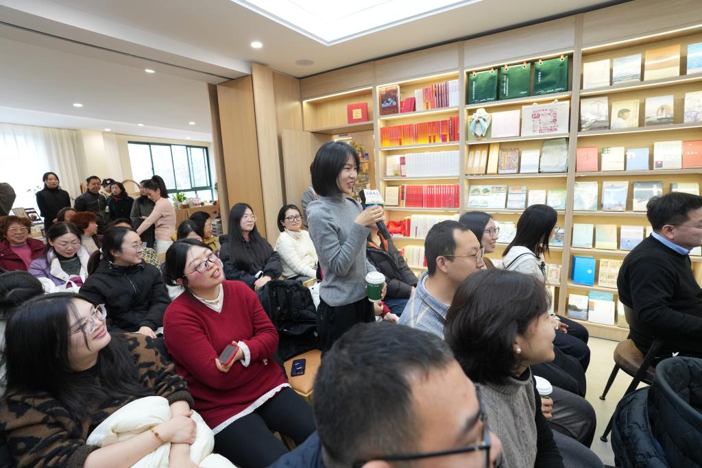 3月5日,在位于吴兴区爱山街道的湖州三联书店,一名市民向授课的学者提问。
