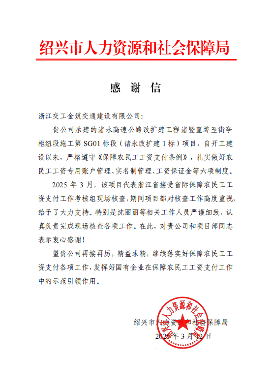 3月12日,浙江省交通集团下属浙江交工金筑交通建设有限公司收到了一封来自绍兴市人力资源和社会保障局的感谢信。信中,绍兴市人社局对交工金筑诸永改扩建1标严格落实农民工工资支付制度、高质量通过省际核查给予评价,同时,也对主要工作人员认真负责的工作态度表达赞誉。