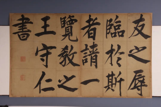 明王守仁楷书客座私祝册页,楷书,纸本,每页纵36.5厘米,横44.0厘米,共12页。整幅作品结体奇峭,用笔刚劲,取势旖侧,法度严谨,体格宽博,兼有颜体的挺拔雄浑与柳体的峻厉瘦硬。内有明末黄道周、清末赵尔萃等所撰多篇题跋。此件曾辗转流传于福建、河南、山东、天津等地。1954年,余姚乡贤洪佐尧用王翚的一幅画从天津大收藏家张静榕处易得,捐献给梨洲文献馆。