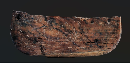 河姆渡遗址出土,距今约6500年,是河姆渡遗址出土众多艺术品中的绝品,也是河姆渡文化的标志。象牙材质,正面中部以阴线雕刻出一幅寓意深奥的图案,由五个大小不等的同心圆构成的太阳纹,上端刻划出炽烈的火焰状,象征太阳的光芒,两侧各有一只展翅欲飞的鸟,圆圆的眼、长长的嘴巴,它们昂首相望,向着太阳。鸟头部两侧各钻有两小圆孔,下侧各钻有一小圆孔,圆孔间以弦纹间斜线组成连弧纹图案。长16.6厘米、残宽5.9厘米、厚1.2厘米。