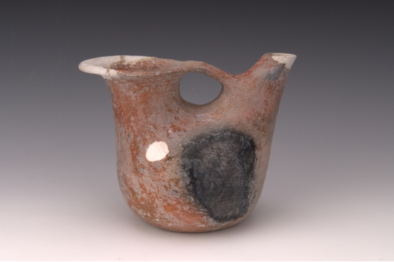 河姆渡遗址出土,距今约6500年,底径8厘米、高13.6厘米。呈立鸟形,故又称鸟形盉。喇叭口,冲天管状嘴,一条宽扁提梁连接口与嘴,腹两侧微鼓,圆形平底,器表留有明显的刮削痕迹。