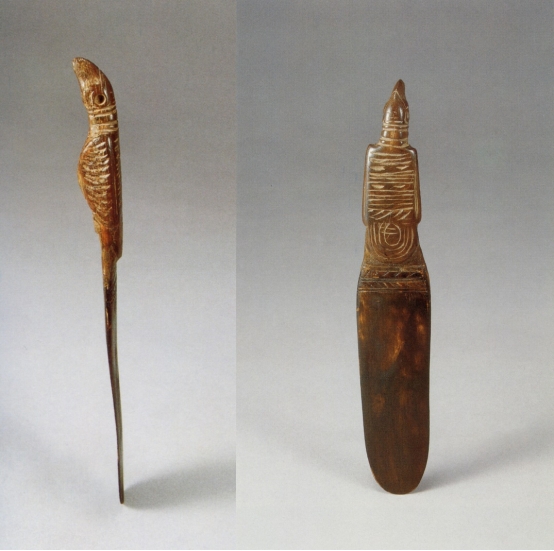 河姆渡遗址出土,距今约7000年。象牙质,长15.6厘米,宽2.7厘米,厚1.4厘米。顶端为鹰嘴大眼的鸟头,宽扁长方形,鸟身正面刻划有弦纹与斜线纹相间组成的纹饰。鸟身以下占全器三分之二呈扁平圆舌形,是为鸟的长尾。整体造型夸张,雕刻及磨工极精。