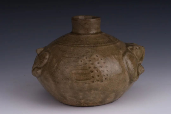 三国越窑青釉蛙形瓷水盂,高9.9厘米、口径3.4厘米,底径7.4厘米。扁圆,蛙形。背部置一筒状口,肩饰双弦纹,腹部饰篦点纹,并堆贴蛙首、四肢及蛙尾。底内凹,胎灰白。通体施青釉,釉色晶莹透明,釉面有冰裂纹。造型生动传神。