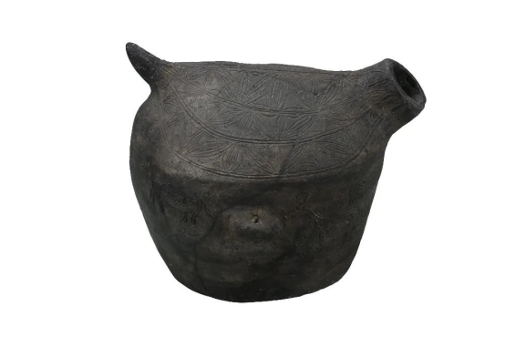 田螺山遗址出土,距今约7000年。夹炭陶。通高22厘米,最大径达26厘米。顶面呈龟背形,正中有脊略呈人字形鼓起,器身斜直腹。顶部以凸脊为界两边对称布满芽叶纹,腹部刻划猪、鹿图案,龟背尾脊下方刻划一火焰纹,具有高度艺术性和思想性,集中代表河姆渡文化发展水平。目前,龟形陶盉属于考古出土物,尚未进行移交,不属于任何博物馆,权属为浙江省文物考古研究所的出土物。