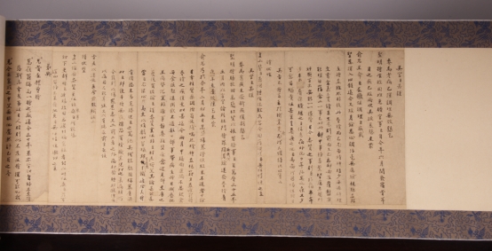 此卷纵28厘米,横439厘米,由奏稿、与昔日同僚书、与家人书三部分组成,是明代书画家孙鑛的作品。孙鑛(1542—1613),字文融,号越峰、月峰,别署湖上散人,浙江余姚孙家境(今属慈溪)人,明万历二年(1574)会元,官至兵部尚书。他工诗文,精书画,兼通戏曲音韵,著述丰富,仅现在可考见的有《评经》《翰苑琼琚》等百余种,一千多卷。其书法清劲绝伦,取法颜、米,主张“天趣”“作字贵在无意”,行草、楷书勾画峭健,秀拔超逸;小楷微参分隶法,端雅苍古,深受邑人喜爱,常以佳扇乞书。