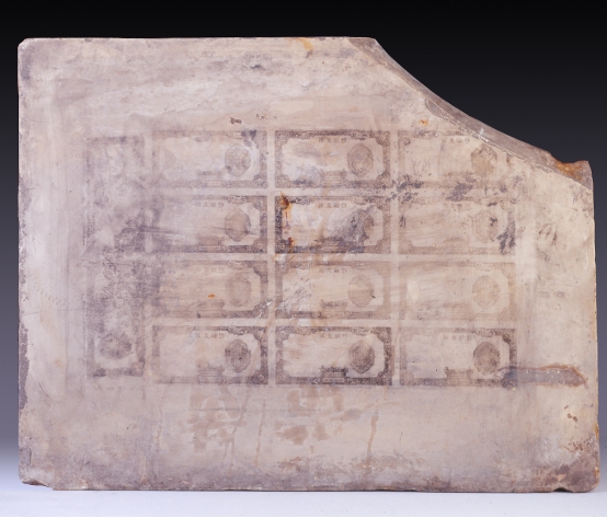 长72.0厘米,宽56.0厘米,厚4.0厘米。模印长14.4厘米,宽7.3厘米。石质,长方形,表面光滑,正面留有十四处抗币模印,一竖四横,竖排一列2张,横排每行3张。长方形边框图案,上端印有“浙东银行”,右侧团花图案中印有面额“拾圆”,下端从左至右印有两行字样,分别为“浙东地方本位币”“中华民国三十四年印”。四角团花图案中各印“拾”。